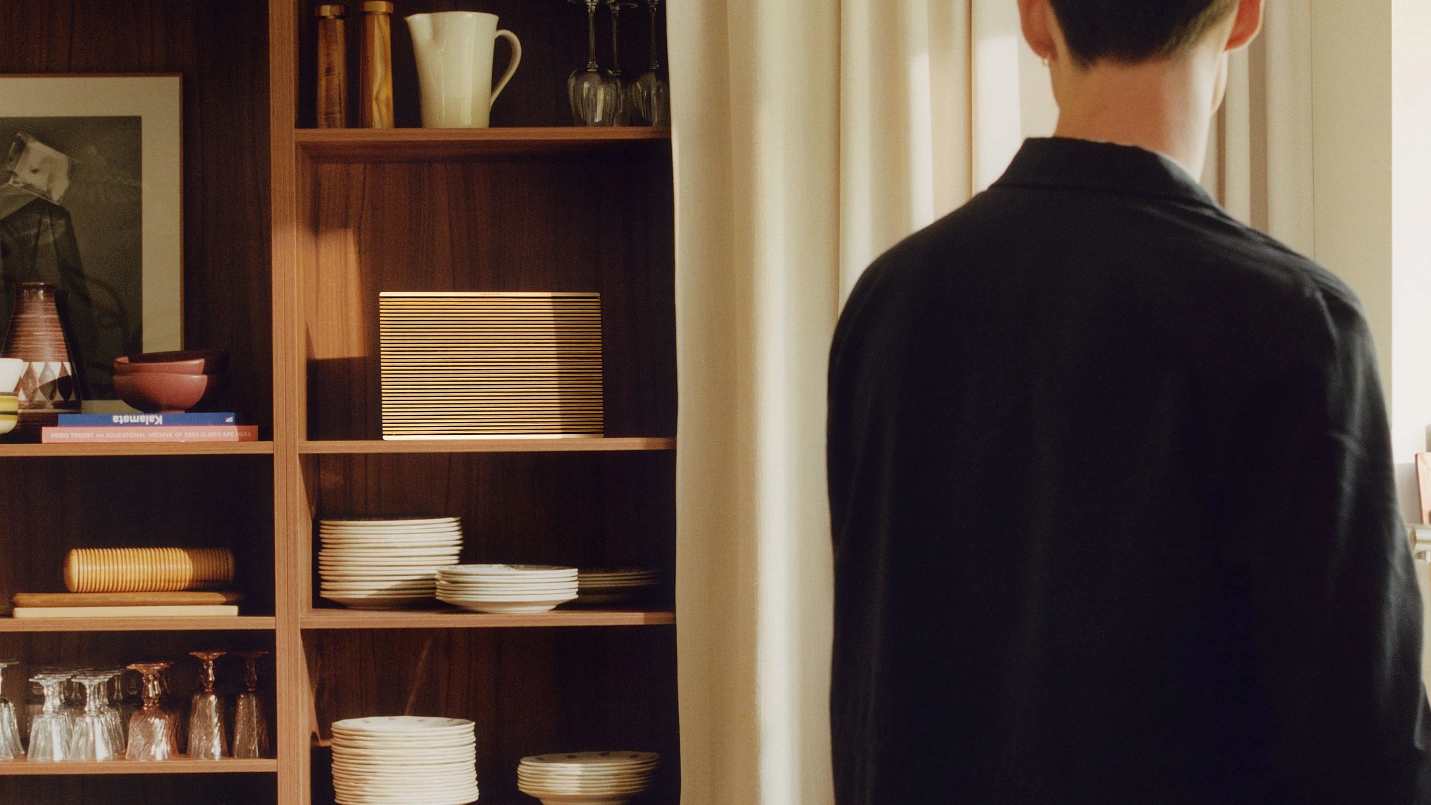 Gold tone Beosound Level on a shelf with other kitchen plates and a man is looking at it